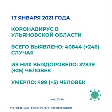 Напомним, согласно оперативным данным на 17 января, в Ульяновской области подтверждено 40844 случая заболевания коронавирусом. За сутки прирост составил 246 случаев. Выздоровело за все время с начала пандемии 37839 пациентов, из них 25 человек за последние сутки. Умерло за все время с начала пандемии 499 пациентов с диагнозом коронавирус, пятеро – за последние сутки.