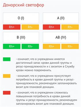 Напомним: система работает по принципу цветовых сигналов. Если группа отмечена зеленым цветом, значит, запас крови сейчас сформирован и визит можно отложить. Желтый сигнал говорит о необходимости плановой донации - кровь этой группы востребована. Красный цвет означает повышенную потребность: такие доноры особенно нужны медицинским учреждениям.
