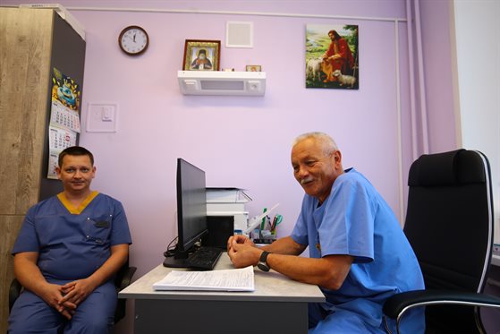 Заведующий хирургическим отделением встречает нас в перерыв между операциями. Через пару минут к нам присоединяется его сын Никита - тоже хирург, работающий здесь, в отделении.