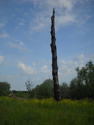 Но интересно это место не только рыбалкой. Неизвестно почему, но именно в этот лесок регулярно в грозу попадают молнии. Здесь в разных местах стоят и лежат десятки деревьев, сожженных небесным огнем, причем все это на достаточно небольшой территории. Иногда встречаются деревья, выжженные до такой степени, что от ствола у комля остается лишь четверть толщины, а по окрестной траве на десятки метров расходятся обугленные лучи. При этом дерево ухитряется стоять и удерживать почти не тронутую крону.