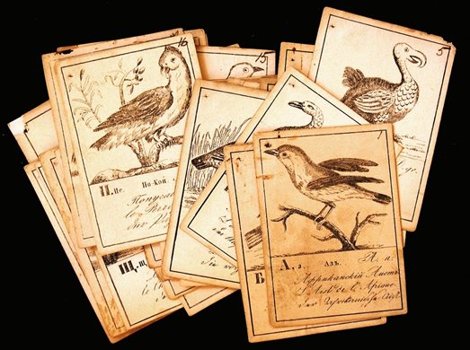 У каждой буквы было словесное наименование: «А» – «Аз», «Б» – «Буки», «В» – «Веди», «Г» – «Глагол». Сейчас, заучивая алфавит, запоминают: «К», «Л», «М», «Н», «О», «П», «Р», «С», «Т». А раньше зубрили: «Како», «Люди», «Мыслите», «Наш», «Он», «Покой», «Рцы», «Слово», «Твердо». Читая по буквам «мама» ученики произносили вслух: «Мы» «Аз» да «Мы» «Аз», и лишь потом слагали получившееся слово. В нашей азбуке каждую карточку, помимо букв, украшало изображение птицы. Причем название давалось на трех языках: русском, французском и немецком. Издатели преследовали благую цель, знакомя детвору одновременно с родным алфавитом, иностранными языками и миром пернатых. Однако наш художник видимо был далек от зоологии, поэтому птички у него не были похожи сами на себя.