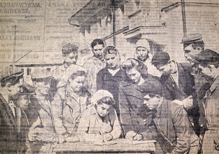 Сбор подписей в поддержку Пакта Пяти. 1951. Из газеты «Ульяновская правда»