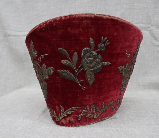 Кокошник от Быкова В. В. (УКМ 6867) изготовлен в виде высокой шапочки из малинового бархата на плотной картонной основе. Передняя часть его более высокая, чем теменная. Форма его верха (дна) – каплевидная. По форме он относится к повойникообразным кокошникам, а по украшению (декору) – к праздничным. Украшен убор золотной вышивкой[1] «рельефной гладью вприкреп настилом по карте», выполненной серебряной канителью. Орнамент вышивки – растительный: цветы (розы) с листьями и веточками, виноградные гроздья на побегах, виноградные лозы. Каждый узор в русских вышивках – это определенные символы, обереги. Цветы – символ молодого рода, счастливой женской судьбы; розы – символ любви; виноград, виноградная лоза – символ семьи, для женщин – это достаток и плодовитость (многодетность). Орнамент «роза и виноград» позднее в вышивке под влиянием городской моды стал олицетворять в народном сознании «сладкую ягодку и аленький цветочек».