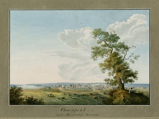 Недавно мне попался на глаза акварельный панорамный рисунок Симбирска первой четверти XIX века неизвестного автора, который находится в коллекции Музея архитектуры им. Щусева. Странно, что название города было написано через «н»: Синбирск, хотя после 1780 года имя города в официальных документах приобрело написание «Симбирск».