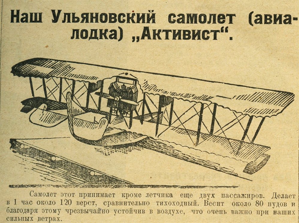 Весной 1925-го в Ульяновске состоялся первый выпуск 32 слушателей авиакурсов. Для агитоблетов были закуплены два самолета: «Земляк Ильича» и гидросамолет «Активист». За ульяновскими самолетами закрепили летчика 1-го класса М. И. Гаркави и старшего механика С. Ф. Вражнова. Михаил Ильич Гаркави родился в 1896 году в Казани, до революции учился в Московском техническом институте, прошел теоретические курсы авиации профессора Жуковского и Петроградскую летную школу. В 1922-м демобилизовался из армии и перешел сначала в «ДОБРОЛЕТ», затем в ОДВФ СССР, с 1925 – в Авиахиме.