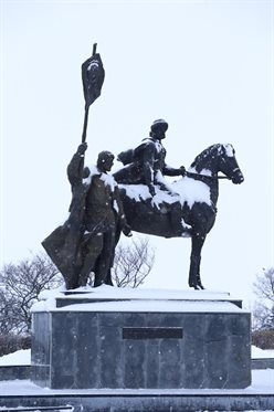 На вопрос, где в Ульяновске можно увидеть настоящего гнедого рысака, горожане отвечают практически моментально: на площади Ленина. Именно здесь на высоком прямоугольном постаменте возвышается пятитонный бронзовый монумент воеводе Богдану Хитрово - основателю Симбирска.