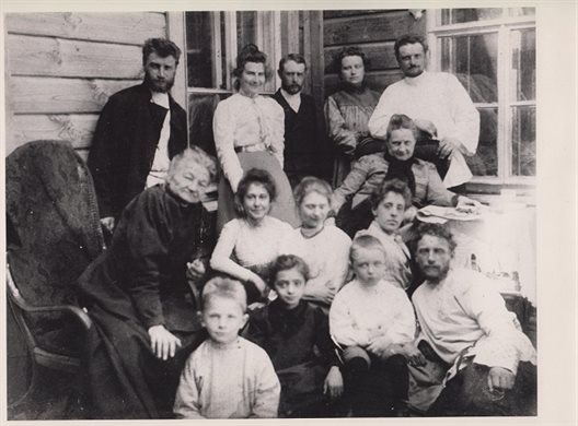 Наталья Львовна Персиянинова (последний ряд, 2-я справа) с сыном Борисом (первый ряд, 2-й справа) вместе с семьёй. 1900 год