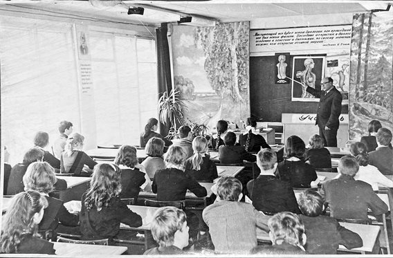 Наш Александр Андреевич был вдохновенным учителем. Так, чтобы детям было интересно посещать его уроки, свой кабинет биологии, владея красками, расписал от пола до потолка по теме «Эволюция растительного мира со времен древнего мира».