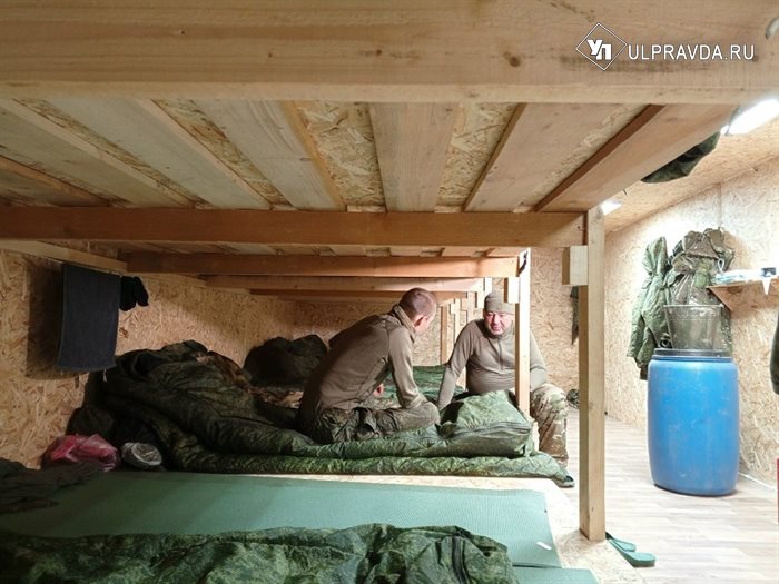 Почему произошло укрупнение блиндажей? Логика здесь простая: солдаты регулярно выезжают на «передок», и в тылу остается лишь малая часть личного состава. И представьте: у вас блиндаж на четверых, и все четверо на позициях. Через месяц они возвращаются и видят, что их «дом» в их отсутствие затопило или он промерз, потому что в нем никто не жил и не топил его. Все нужно начинать заново. А если сделать блиндаж на 28 человек, в нем в любом случае останется кто-то и будет поддерживать тепло, присматривать за вещами. На практике в блиндаже, который показали нам, находились четверо – остальные были на позициях.
