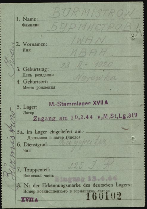 ФОТО: Учётная карточка немецкого лагеря военнопленных Шталаг XVII-А, заполненная 13 апреля 1944 года.