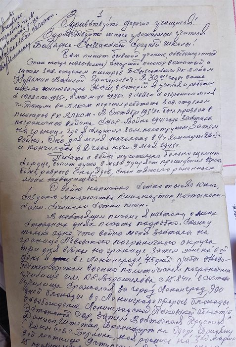 «Здравствуйте дорогие учащиеся и учителя Базарно-Сызганской средней школы. Вам пишет бывший ученик, освобожденный (так тогда назывались) старший вожатый Кузьмин Василий Григорьевич. В 30-е годы ваша школа именовалась НСШ (неполная средняя), в которой я учился и работал. В мае 1935 года перешел на работать зав. отделом пионеров РК ВЛСКМ. В октябре 1937 года был призван в пограничные войска СССР.