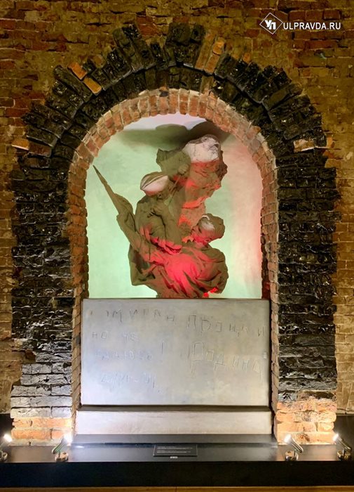 Копия легендарной надписи "Умираю, но не сдаюсь". "Оправой" для нее стали расплавленные кирпичи, собранные на руинах Брестской крепости. Это фашисты выжигали огнеметами из подвалов защитников крепости. Кирпичи плавились, но наши стояли насмерть