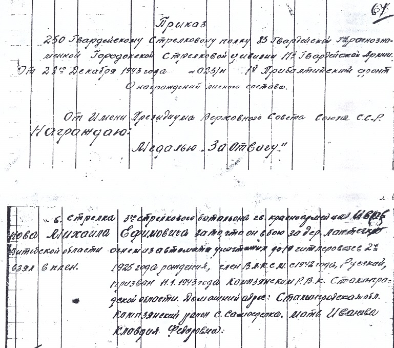 О боевых делах в Белоруссии рядового Иванова свидетельствуют документальные материалы центрального архива Министерства обороны России. В частности, приказы по 250-му гвардейскому полку 83-й гвардейской стрелковой дивизии № 023/Н от 21 декабря и №025/Н от 28 декабря 1943 года. В первом, о награждении личного состава от имени президиума Верховного Совета Союза ССР орденом Славы III степени, сказано: «21 декабря 1943 г. гвардии рядовой 250-го стрелкового полка, автоматчик Иванов М.Е. участвовал в штурме сильно укрепленной гитлеровцами высоты 203,6 на подступах к райцентру Городок Витебской области, под ураганным пулеметным и минометным огнем противника в числе первых бойцов ворвался во вражеские окопы и уничтожил 4-х фашистов…». Во втором приказе, где он представлен к награждению медалью «За отвагу» написано: «Стрелок 3-го стрелкового батальона 250-го стрелкового полка гвардии красноармеец Иванов Михаил Ефимович в бою за деревню Лаптевка Витебской области огнем из автомата уничтожил до 10 гитлеровцев, двоих взял в плен, несмотря на то, что был ранен».