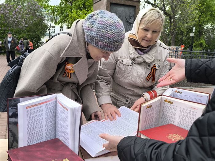 Гости сквера просматривают Мемориальные книги: «Солдаты Победы», «Книга памяти», «Солдаты трудового фронта», «Детство, опалённое войной», находят имена родных и близких — участников войны.