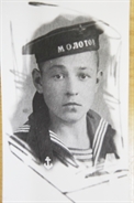 Бескозырка с надписью «Школа юнг ВМФ». Рядом фото - молодой матрос на палубе военного корабля, на груди - медаль, на бескозырке надпись «Молотов». Здесь же кадры военной хроники, крейсер «Молотов» у причала осажденного Севастополя ведет огонь из орудий крупного калибра по немецким частям...
