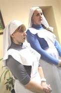 Наши собеседницы - студентки третьего курса медицинского колледжа Анна Кузнецова и Татьяна Киндеева. Учатся они на отделении сестринского дела и попутно помогают в качестве волонтеров в хосписе. Но это не совсем обычные медработники - в косынках, передниках с изображением православного креста, вписанного в красный, на груди. Так выглядят современные сестры милосердия.