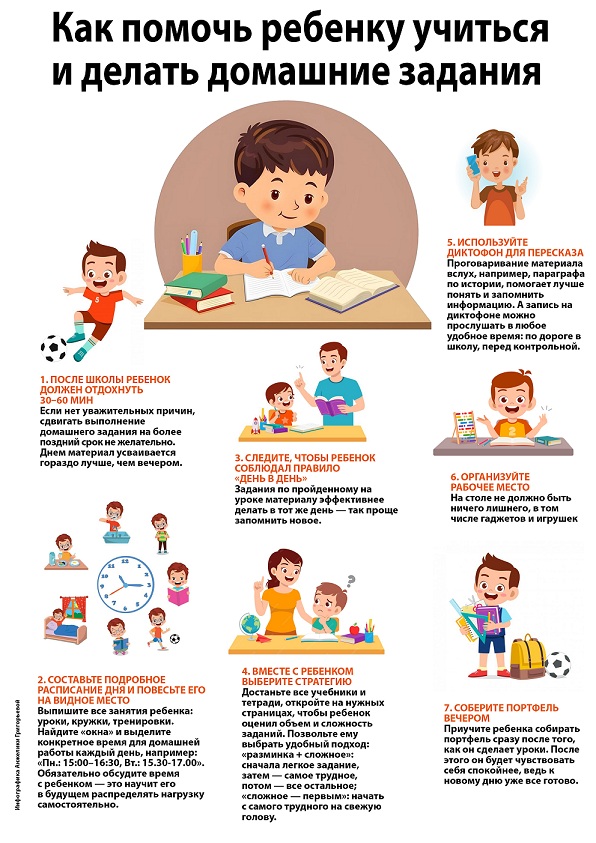 «Вектор все равно задают родители. Как они настроят ребенка, как подготовят, как организуют процесс обучения, так он и пойдет. Поэтому надо с самого начала приучать детей к самостоятельности, к режиму  дня и к порядку за рабочим столом. Гаджеты, игрушки  убираются однозначно. Пусть ребенок сделает сам домашнюю работу на черновик. Потом мама проверит - и чистовая работа займет уже гораздо меньше времени. А устные задания вполне можно учить, пока мама, например, готовит ужин. Ну и мотивация, конечно, нужна ребенку обязательно: будь то совместная прогулка, любимая секция, просмотр кино или игры. Он должен четко понимать, что чем быстрее сделает уроки, тем быстрее освободится и сможет заняться любимым делом», - советует Екатерина.