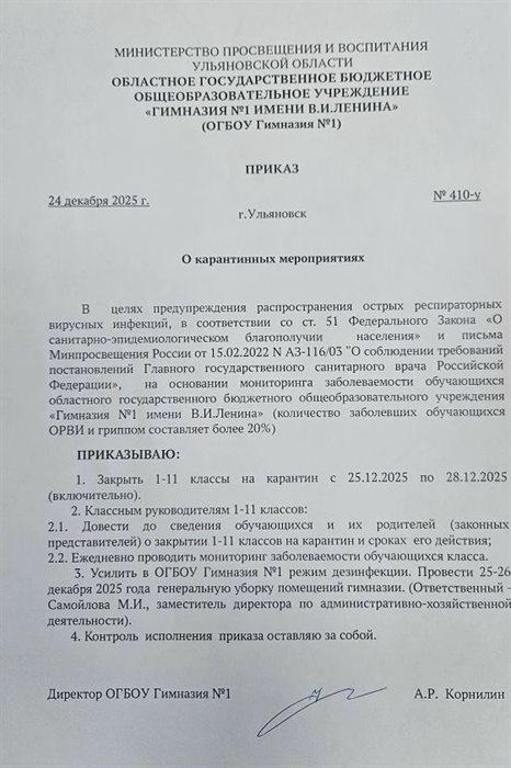 С 25 по 28 декабря включительно с 1-го по 11-й класс гимназии № 1 в Ульяновске закрыты на карантин.