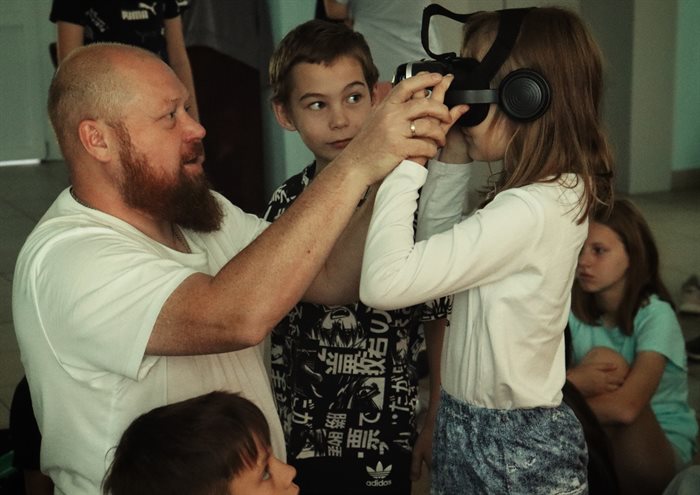 Команда лекторов Общества «Знание» и научных сотрудников демонстрирует ребятам учебный фильм, модели, напечатанные на 3D-принтере, фотовыставку и 360-градусные панорамы Геопарка в vr-очках.