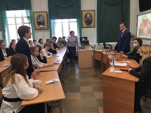 Накануне с учениками 8-го «В» класса Мариинской гимназии встретился первый заместитель председателя комитета Совета Федерации по бюджету и финансовым рынкам Сергей Рябухин, который в 2020 году был награждён орденом Александра Невского.