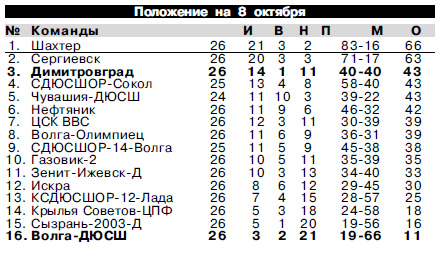3 октября. Ульяновск. Стадион "Старт". 50 зрителей. ВОЛГА-ДЮСШ: Люков, Сагдиев, Бабош, Загреев, Овсянников, Салахутдинов, Шакеев (Васютов, 70), Ефимов (Капралов, 65), Дмитрий Рахманов, Ослоновский, Г.Заикин. Голы: Панкратов, 6 (0:1); Г. Заикин, 52 (1:1); Захарян, 57 (1:2); Дмитрий Рахманов, 70 (2:2); Захарян, 83 (2:3).