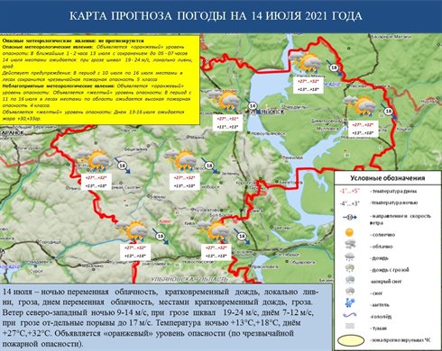По данным специалистов Ульяновского центра по гидрометеорологии и мониторингу окружающей среды, днем 14 июля на территории региона прогнозируется переменная облачность, местами кратковременный дождь, гроза. Ветер будет дуть северо-западный со скоростью 7-12 метров в секунду. При грозе отдельные порывы до 17 метров в секунду. Температура воздуха: днём +27°С... +32°С.