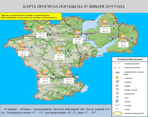 По данным специалистов Ульяновского центра по гидрометеорологии и мониторингу окружающей среды, опасные и неблагоприятные метеорологические явления 3 января на территории нашего региона не прогнозируются. Ожидается облачная погода, с прояснениями, местами возможен небольшой снег. Ветер будет дуть южный, со скоростью 6-11 метров в секунду. Температура воздуха днем -5°…-10°.