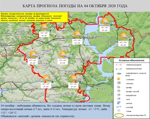 По данным специалистов Ульяновского центра по гидрометеорологии и мониторингу окружающей среды, 4 октября ожидается погода без осадков, небольшая облачность. Ветер будет дуть северо-восточный со скоростью 6-11 метров в секунду. Температура воздуха днём +11°, +26° С.