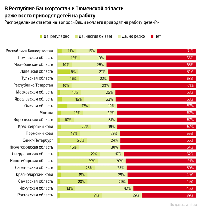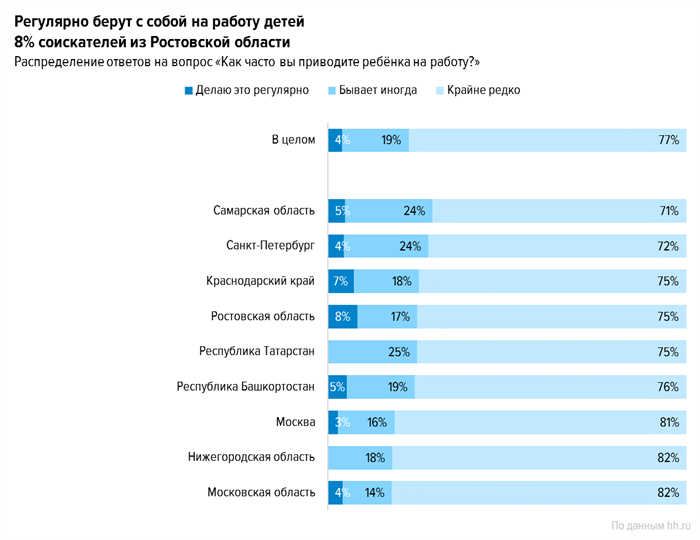 Довольно мало людей приводят своих детей на работу регулярно (4%). Большинство делает это крайне редко (77%). Чаще всего приводят на работу детей регулярно представители сфер маркетинга (8%) и продаж (6%), а также 8% соискателей из Ростовской области.
