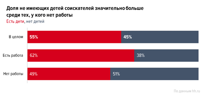 В целом россияне, у которых есть дети и у которых нет детей, распределились примерно поровну (55% и 45% соответственно). Однако если посмотреть на тех наших соотечественников, у которых есть работа, то выясняется, что доля имеющих детей там гораздо больше (62%), чем среди безработных на данный момент респондентов (49%).