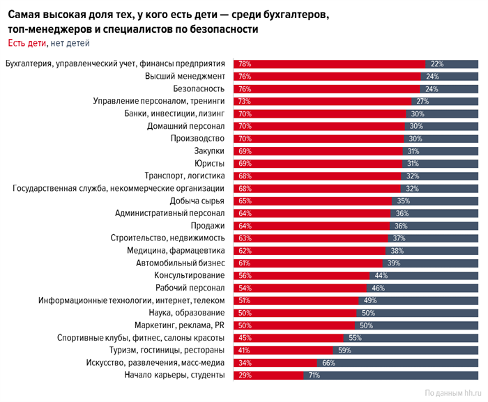 Наиболее высокая доля соискателей, имеющих детей, оказалась среди представителей бухгалтерской сферы и топ-менеджеров. Напротив, меньше всего эта доля среди студентов и тех, кто только начинает свою карьеру (29%), а также среди представителей сферы искусства и развлечений (34%).