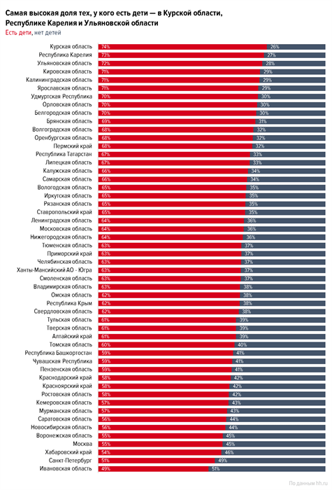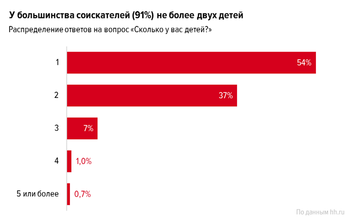 В регионах наибольшая доля соискателей, у которых есть дети, среди жителей Курской области (78%), Республики Карелия (76%) и Ульяновской области (76%). Наименьшая - среди жителей Хабаровского края (54%), Санкт-Петербурга (51%) и Ивановской области (49%).