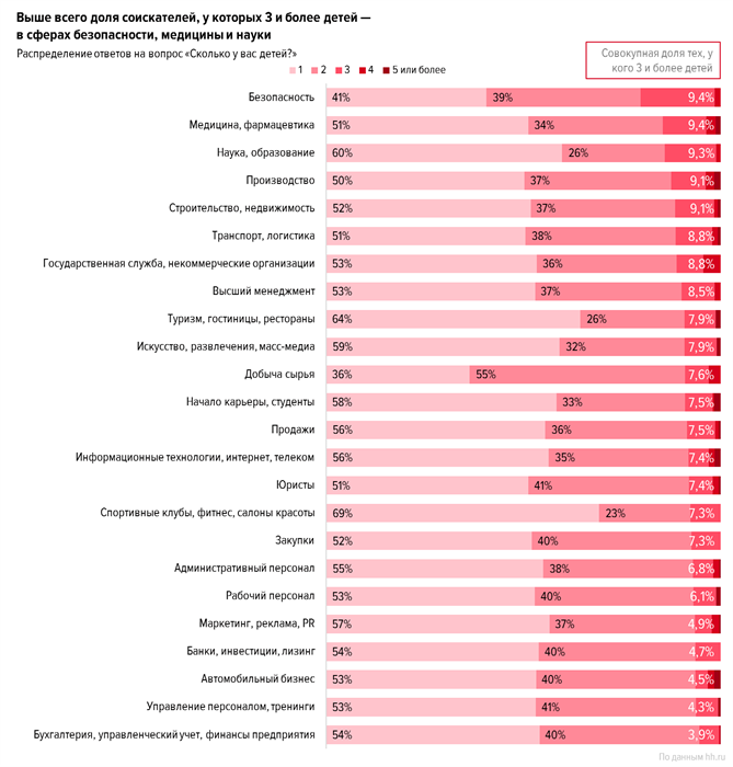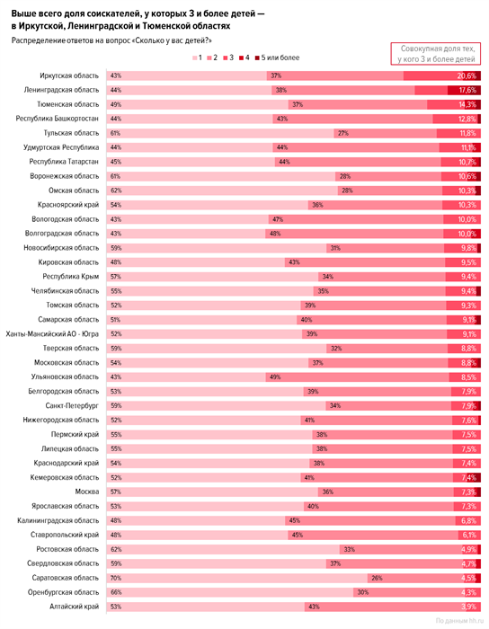 Тех, у кого 3 и более детей, больше всего в Иркутской (20,6%), Ленинградской (17,6%) и Тюменской областях (14,3%), а также среди представителей сфер безопасности (9,4%), медицины (9,4%) и науки (9,3%).