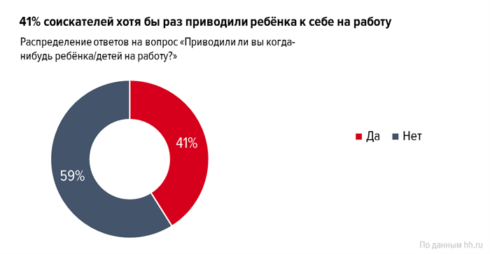 Хотя бы раз приводили на работу своего ребёнка 41% респондентов. Выше всего эта доля среди соискателей из Кировской области (64%) и сферы «Высший менеджмент», ниже всего — среди соискателей из Липецкой области (25%) и в сферах «Рабочий персонал» и «Государственная служба».