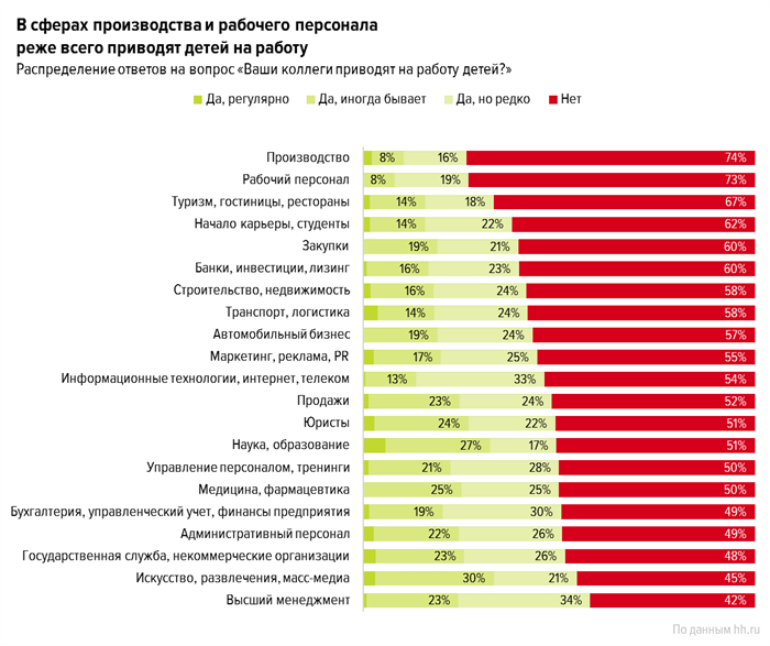 При этом работающие соискатели в большинстве своём заявляют, что их коллеги никогда не приводят на работу своих детей (55%). Выше всего эта доля в сфере производства (74%), а также в Республике Башкортостан (71%).