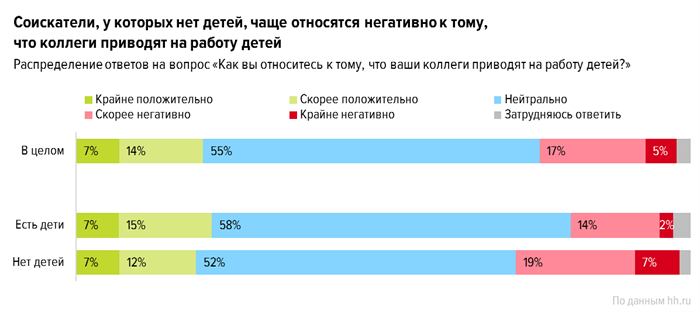 Среди соискателей, у которых есть дети, доля тех, кто негативно относится к тому, что их коллеги приводят на работу своих детей, значительно ниже (16%), чем среди тех, у которых нет детей (26%).
