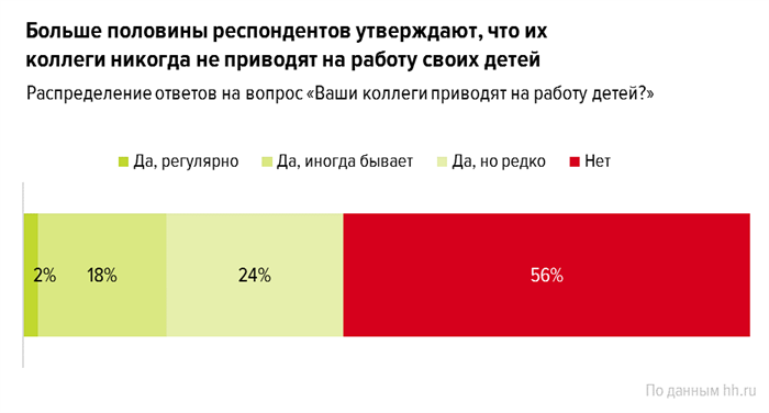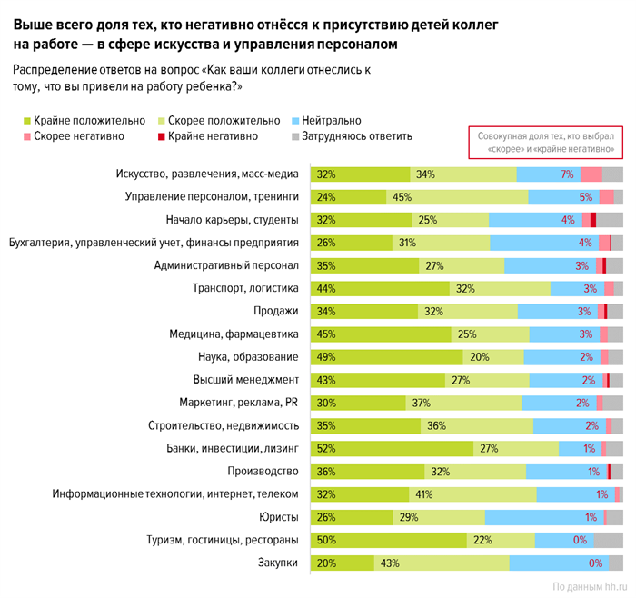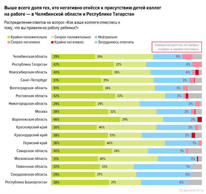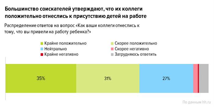 66% соискателей утверждают, что их коллеги положительно отнеслись к тому, что они привели своих детей на работу. Лишь 2,5% заявили о негативном отношении коллег. Выше всего доля таких респондентов в сфере искусства (7%), а также в Челябинской области (5%) и Республике Татарстан (4%).