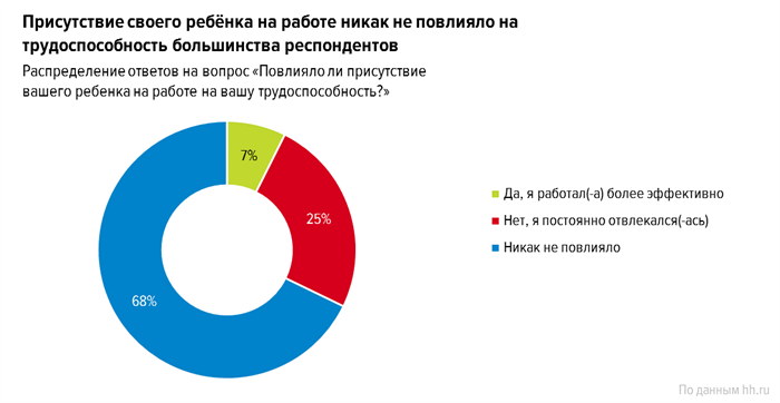 Четверть соискателей, приводивших детей к себе на работу, заявили, что постоянно отвлекались, и это негативно сказалось на их трудоспособности: выше всего доля таких респондентов среди юристов (36%), а также среди соискателей из Красноярского края (37%). Однако подавляющее большинство утверждают, что это никак не повлияло на их трудоспособность.