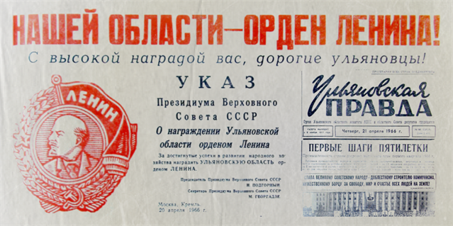 Сегодня – важная дата в истории нашего края. 20 апреля 1966 года Ульяновская область Указом Президиума Верховного Совета СССР за достигнутые успехи в развитии народного хозяйства награждена высшей наградой СССР - Орденом Ленина.