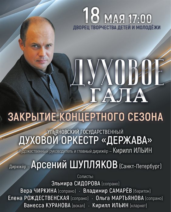 В воскресенье программой «Духовое гала» закроет сезон Ульяновский государственный духовой оркестр «Держава».  Панорама музыки, охватывающая полтора столетия, представит саундтреки из кинофильмов, фрагменты из опер, оркестровых сюит, эстрадные композиции. (6+).