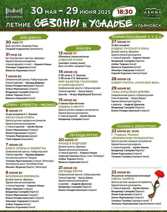Однако меломаном не стоит унывать. Уже 31 мая откроются «Летние сезоны в усадьбе». Программу размещаем заранее, чтобы ценители успели приобрести билеты.