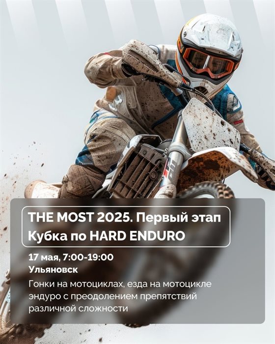 17 мая в Ульяновске состоится ежегодная тренировка по эндуро «The MOST 2025», а победители поборются за кубок Ульяновской области по этой дисциплине. Эндуро - это дисциплина мотоспорта в агрессивном стиле езды по бездорожью и на специальных спортивных трассах с бревнами, валунами и другими препятствиями. Заезды состоятся в северной части Ульяновска, ул. Уютная (за коттеджным поселком). Точные координаты 54.377498, 48.382005. Начало заездов в 11:30. (16+).