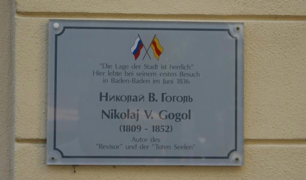 Николай Васильевич Гоголь (1809–1852) не раз бывал в Баден-Бадене. Оказавшись впервые здесь в 1836 году, он неожиданно встретил здесь свою «музу» – Александру Осиповну Россет-Смирнову (1809–1882). «Я живу теперь в знаменитом курорте Баден-Баден, – писал он своей матери 14 августа. – Хотел здесь остановиться на три дня, но уже три недели не могу вырваться отсюда. Встретил здесь достаточно много знакомых. Здесь нет никого, кто был бы серьезно болен. Все приезжают сюда, чтобы развлечься. Расположение города прекрасно. Магазины, курзал, театр – всё находится в саду. Почти никто не задерживается у себя в отеле, все сидят целый день за маленькими столиками под деревьями».