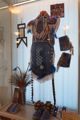Вот такое соединение европейских вещей и народных представлений. Кстати, это платье и стоящие рядом с ними женские мокасины с вышитыми цветами уж очень напоминают что-то родное и знакомое - костюмы коренных жителей Поволжья. Может быть, наши связи с американским континентом не ограничиваются одной Аляской?