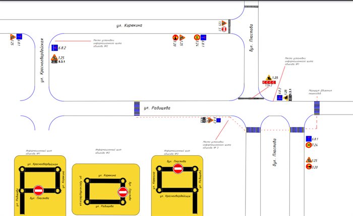 Движение машин по бульвару Платова – на участке между улицами Радищева и Корюкина (включая перекрёсток Пластова – Корюкина) будет запрещено с 11 мая до 30 июня.