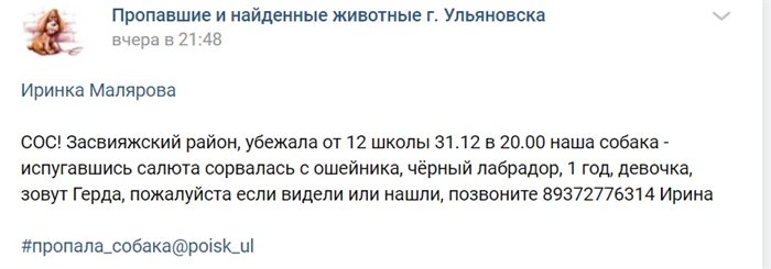 Все случилось около восьми вечера во дворе 12 школы Засвияжского района города Ульяновска. Веселая семейная прогулка обернулась долгими поисками домашней любимицы. Внезапные громкие залпы фейерверков и петард так напугали веселого лабрадора Герду, что та вырвалась из ошейника и убежала в неизвестном направлении. Так быстро, что не успели ни поймать, ни отследить где же она могла спрятаться.