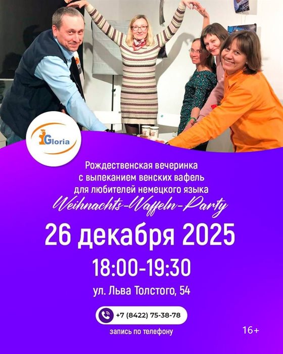 Культурно-языковой центр «Глория» приглашает любителей немецкого языка на Рождественскую вечеринку с выпеканием венских вафель. В программе: игра «Что? Где? Когда?» на немецком языке, загадки о Королевстве Лихтенштейн, приготовление венских вафель и глинтвейн, чаепитие и вкусности, рождественские подарки. (16+)