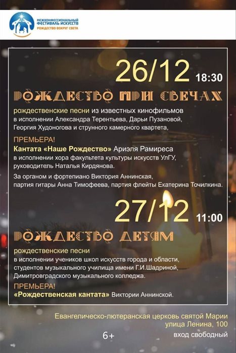 В лютеранской церкви Святой Марии (кирха) в эти дни проходит межконфессиональный рождественский фестиваль «Рождество вокруг света». 26 декабря в 18:30 кирха приглашает на концерт «Рождество при свечах», 27 декабря в 11:00 – на детскую утреннюю программу «Рождество детям». Вход свободный. (6+)