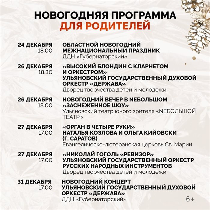 Городские экскурсии тоже будут посвящены новогодним традициям. 27 декабря в 17:00 АНО «СимбирСити» приглашает на пешеходную экскурсию-спектакль «Ваня Гончаров рассказывает… Новый год в Симбирске», 28 и 29 декабря - на прогулку «Рождественский Ульяновск». (12+)