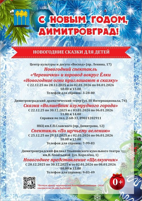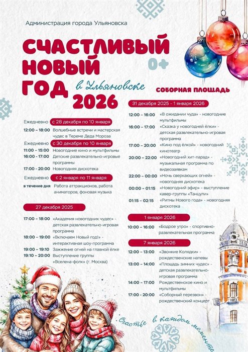 Новогодние представления и развлечения для детей и взрослых вошли в пиковую фазу. Во всех парках Ульяновска в эту субботу будут проходить веселые игровые программы со Снегурочкой, Дедом Морозом и другими сказочными персонажами. Открытие главной елки Ульяновска и терема Деда Мороза на Соборной площади состоится 27 декабря. Смотрите афиши и планируйте праздничный досуг вместе с детьми. (0+)